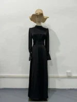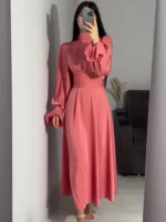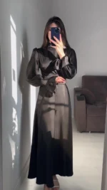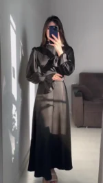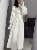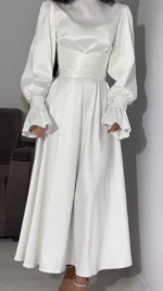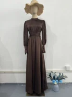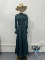 Le design se distingue par un col montant raffiné et des manches bouffantes resserrées aux poignets, apportant une touche de romantisme dramatique. La taille est marquée par une ceinture large intégrée qui structure la silhouette tout en laissant place à une jupe fluide au tombé lourd. Que vous soyez à Paris, Londres ou Dubaï, cette pièce vous assure une allure de tapis rouge tout en respectant les codes de la Modest Fashion.