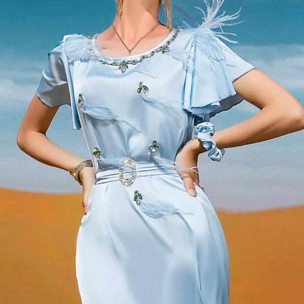 Cette robe arabe dispose de finitions en plumes et d’un tissu en Polyester ultra-doux et fluide très agréable à porter !