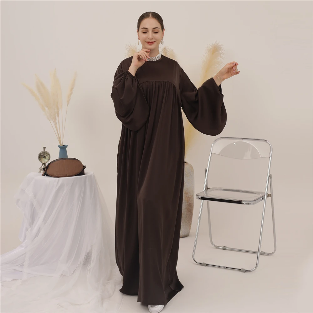 Ce modèle se distingue par un buste délicatement froncé qui apporte une texture raffinée et une liberté de mouvement totale. Les manches bouffantes XXL avec poignets élastiqués ajoutent une touche dramatique et romantique, très en vogue dans la “Modest Fashion” actuelle. Que vous soyez à Paris, Genève ou Dubaï, cette robe offre un tombé lourd et fluide qui sublime la démarche sans marquer les formes.