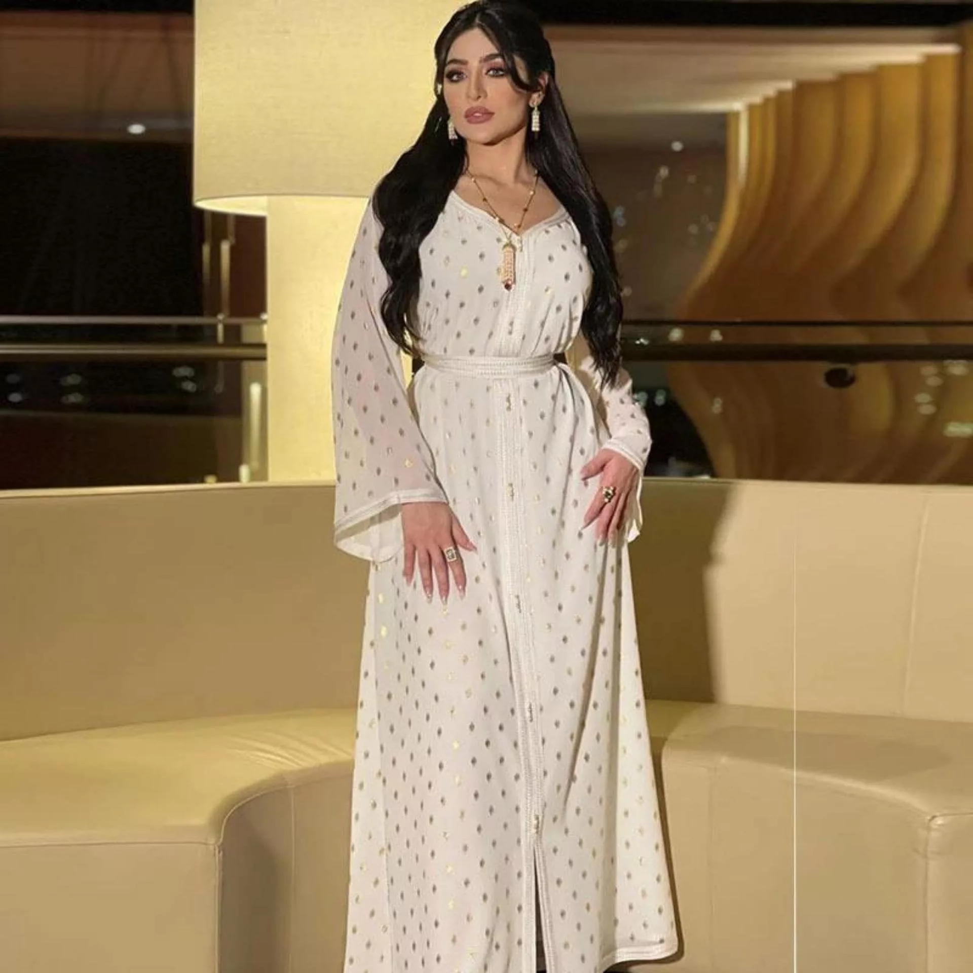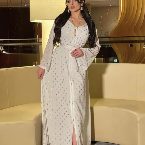 À mi-chemin entre robe orientale ancestrale et robe marocaine moderne, ce modèle est à la fois élégant et confortable, grâce à son tissu fluide et doux en Polyester de haute qualité !