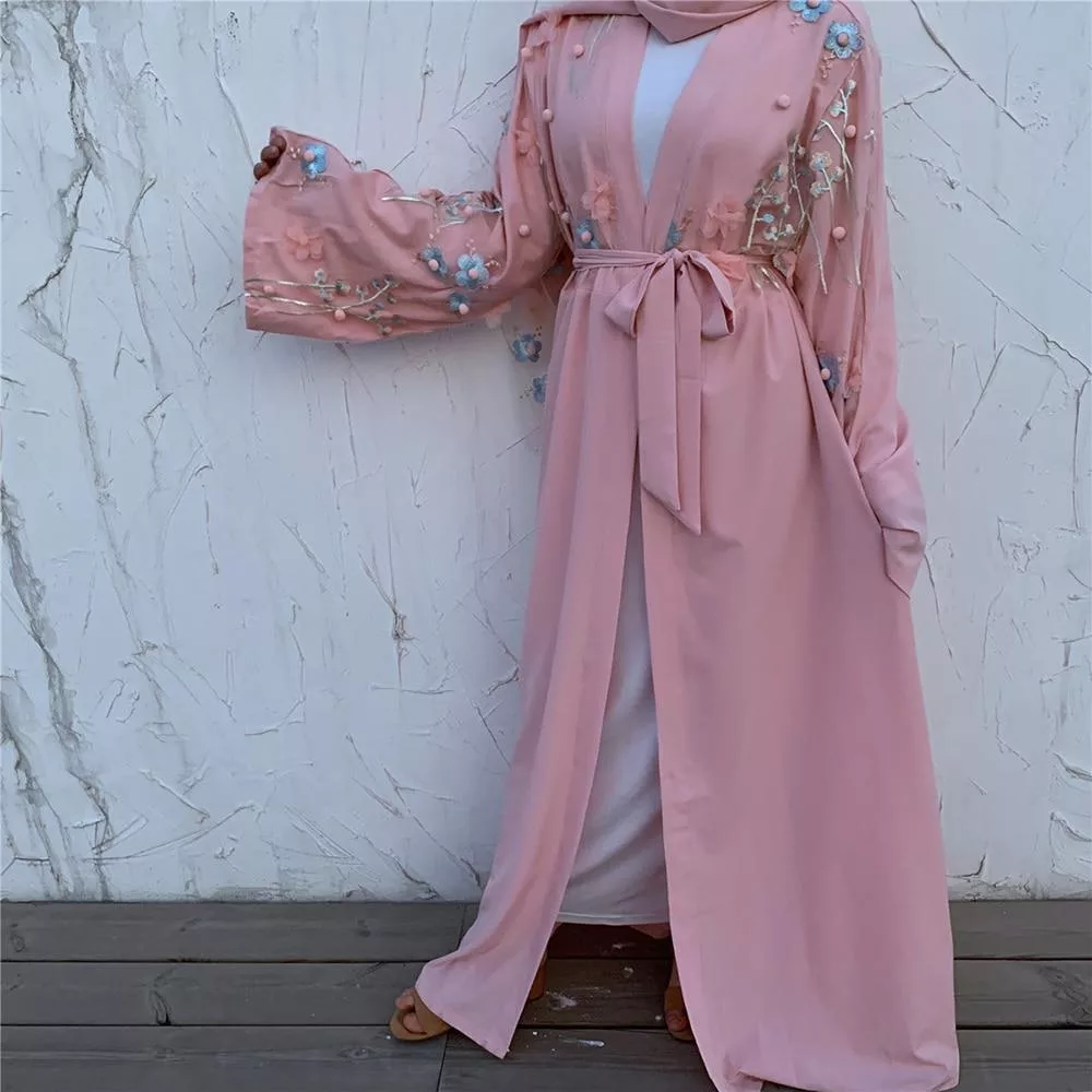 Cette abaya kimono & hijab floral rose est brodée de différents motifs floraux te donneras une touche de modernité grâce à son originalité. Cette abaya est réglable avec son turban comme toute abaya kimono. Cette abaya et son hijab t’apportera un look moderne et tendance. Tu peux porter cette abaya d’un simple hijab à un hijab extravagant. Elle est facile à porter et son design est très moderne.