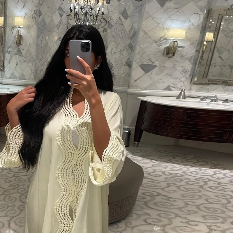 - Matière Aérienne : Confectionnée dans une mousseline de soie légère et vaporeuse, elle offre un mouvement gracieux à chaque pas, idéale pour les climats de Dubaï ou de Tunisie.