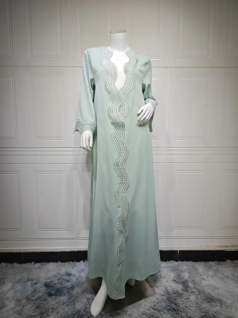 - Coupe & Style : Une coupe ouverte (Open Abaya) qui se porte sur une robe de base (fond de robe). Son coloris vert d’eau pastel est une invitation à la sérénité, très prisée pour les événements esturaux en Suisse ou au Luxembourg.