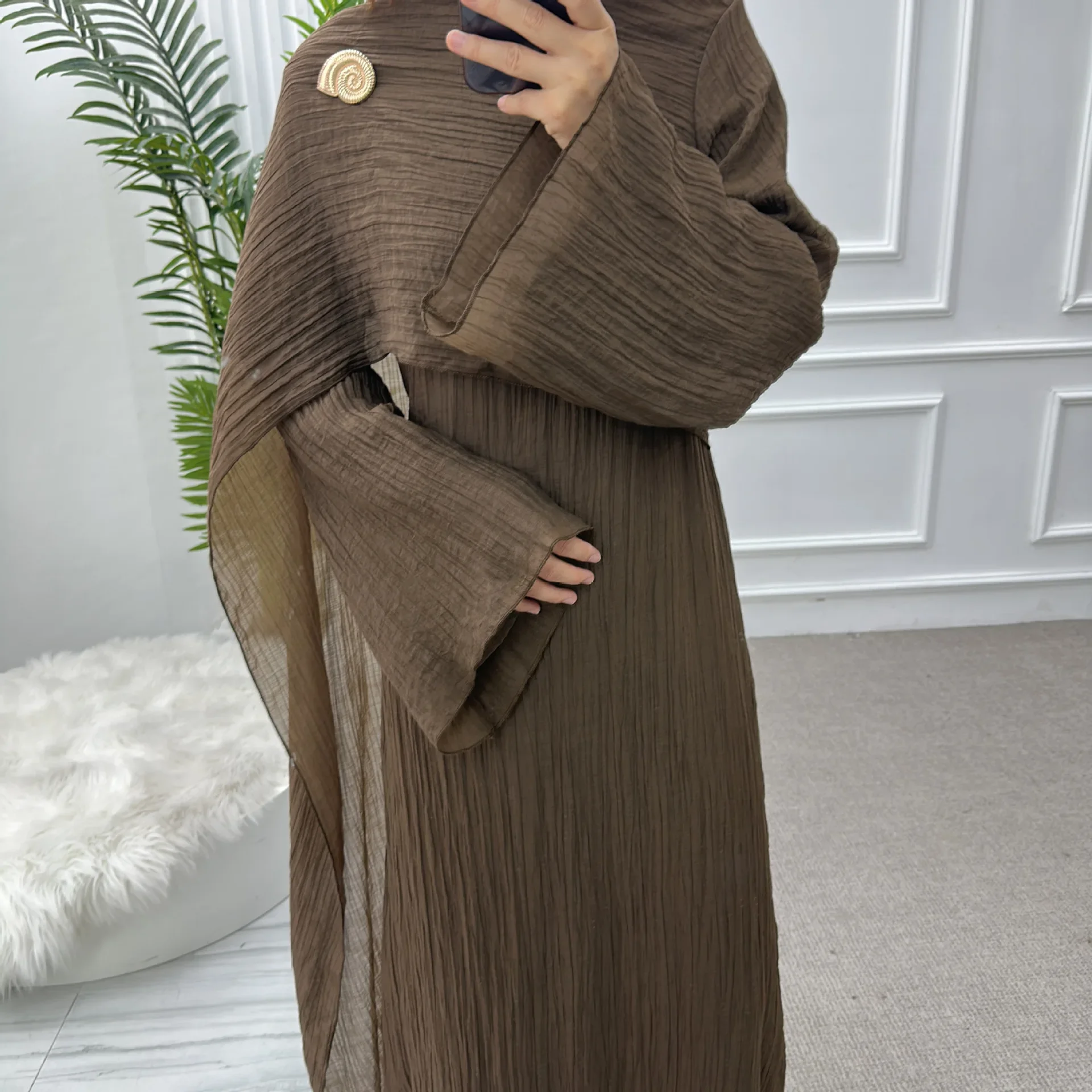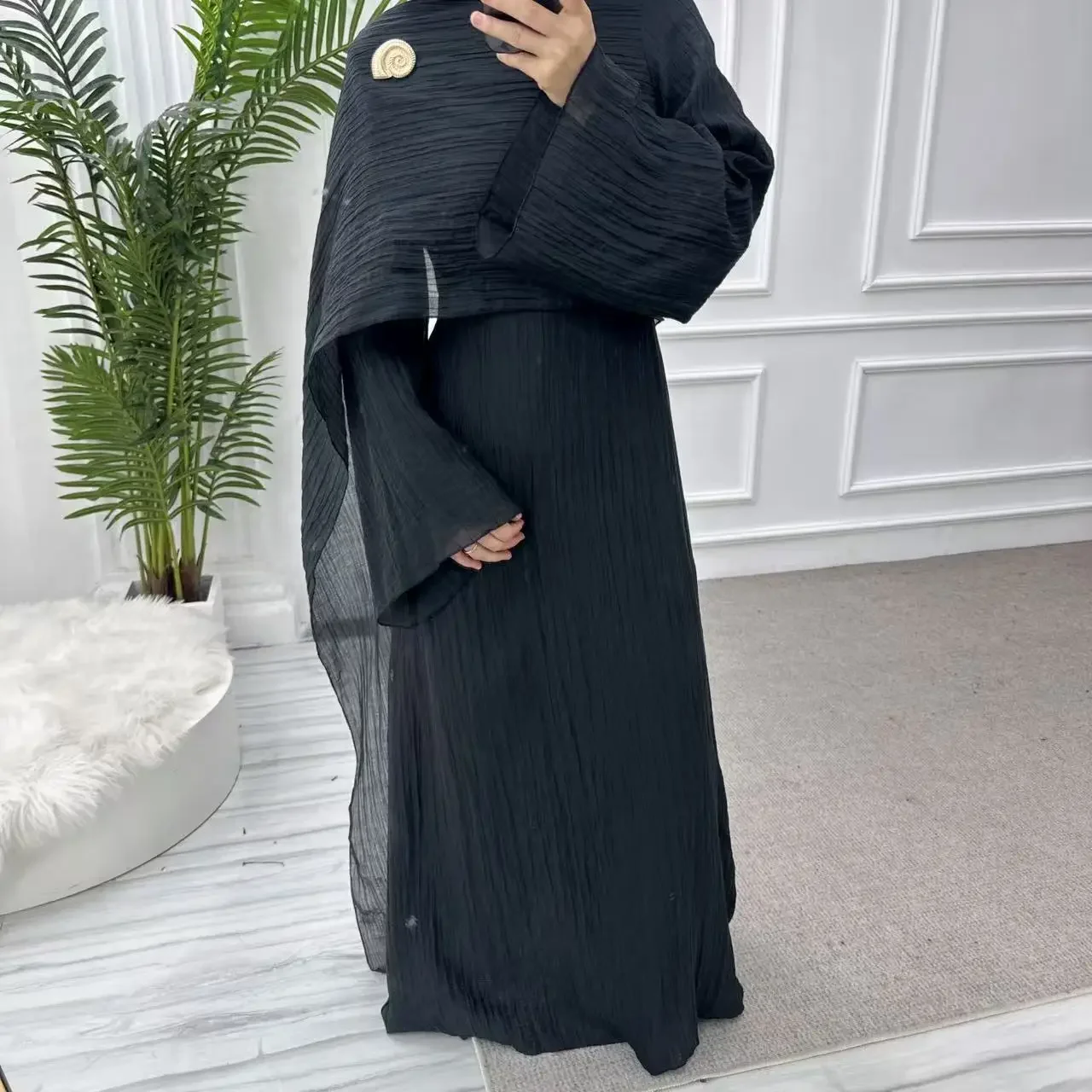 L’Ensemble Complet : L’abaya est accompagnée de son Hijab (voile) assorti dans la même soie froissée. Porté sur l’épaule ou drapé autour du visage, il complète l’unité visuelle de la tenue pour un total look monochrome absolument irrésistible.