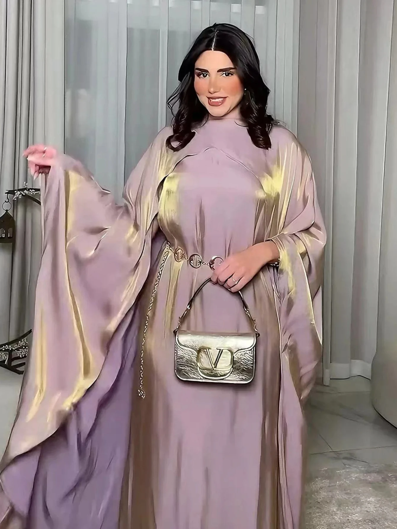 La taille est élégamment marquée par une ceinture chaîne dorée à maillons, ajoutant une touche de modernité “bijou” à cette silhouette traditionnelle. Sa coupe fluide et son tissu de haute qualité garantissent une opacité totale et un confort absolu pour vos célébrations de l’Aïd (Eid) ou vos soirées de Ramadan. Que vous soyez à Paris, Londres ou Casablanca, cette pièce vous assure une présence inoubliable.