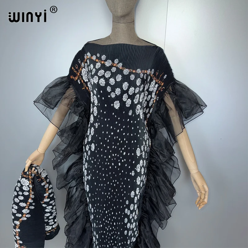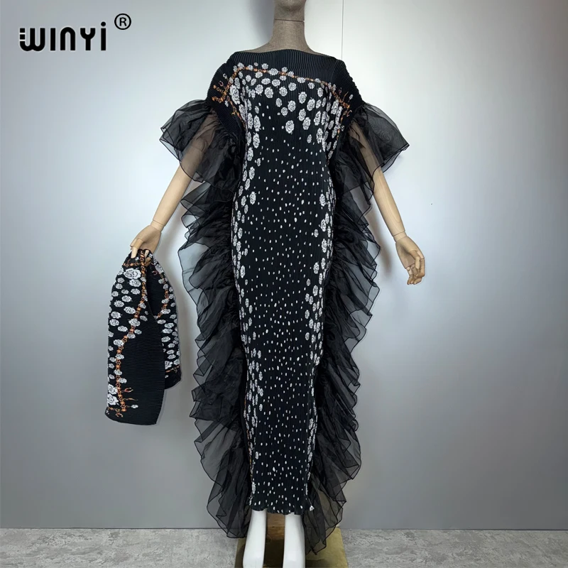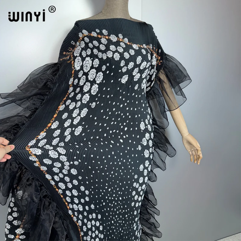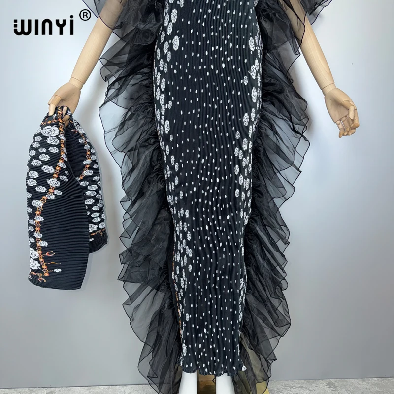 Un Design Architectural et Aérien Le point focal de cette Abaya réside dans ses majestueux volants en tulle noir qui encadrent la silhouette avec une précision architecturale. Ces couches de tulle léger créent un effet “papillon” spectaculaire, apportant du volume et un mouvement dramatique à chaque pas. Le corps de la robe, en tissu plissé premium, épouse délicatement les formes tout en respectant les codes de pudeur, une esthétique très prisée en Algérie, au Maroc et en Tunisie.