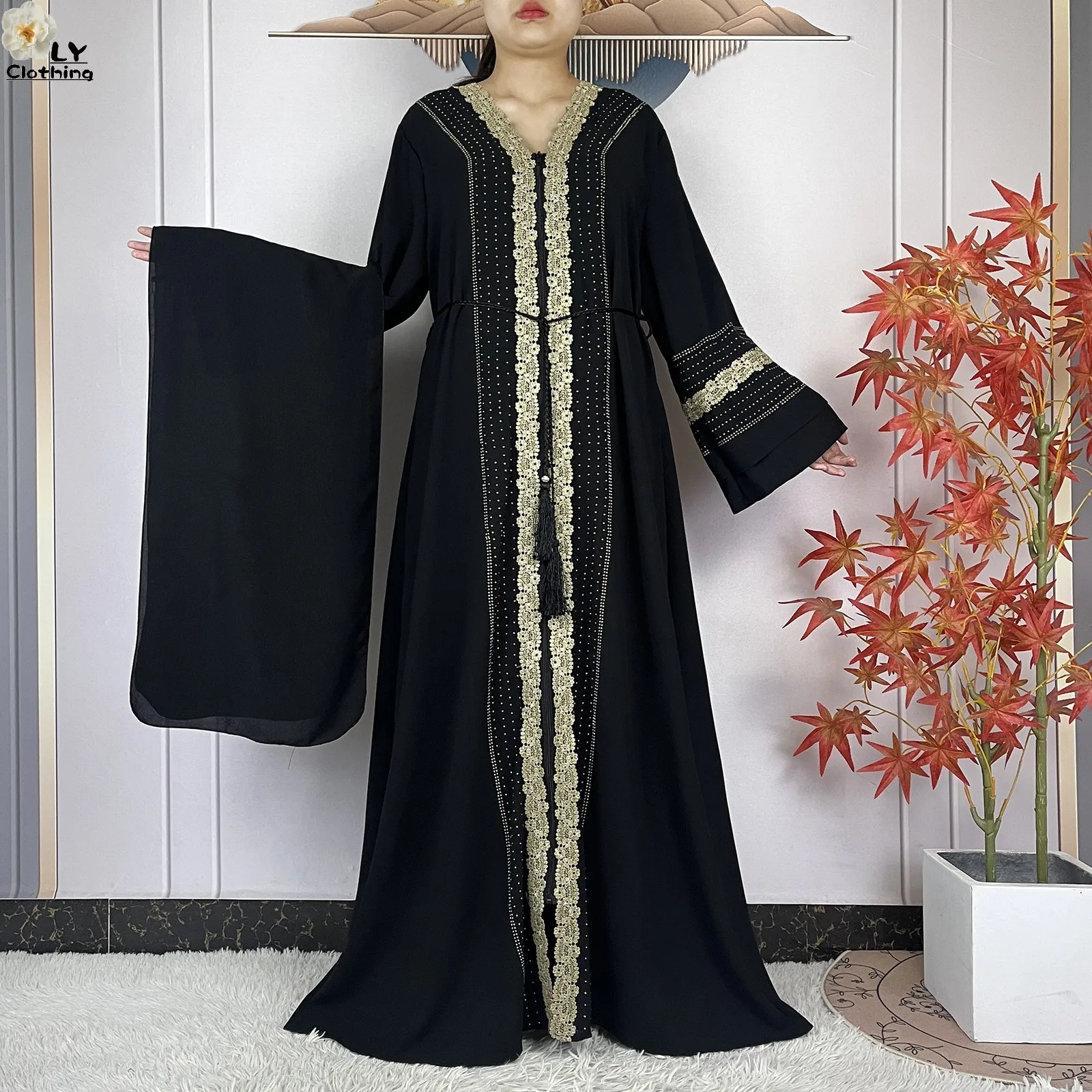 L’élément central de cette pièce est son travail d’ornementation. Les bordures sont soulignées par une galonnerie dorée artisanale richement travaillée, incrustée de détails scintillants qui captent la lumière à chaque pas. Ce contraste entre le noir profond et l’éclat de l’or crée une harmonie visuelle digne des plus grandes réceptions.