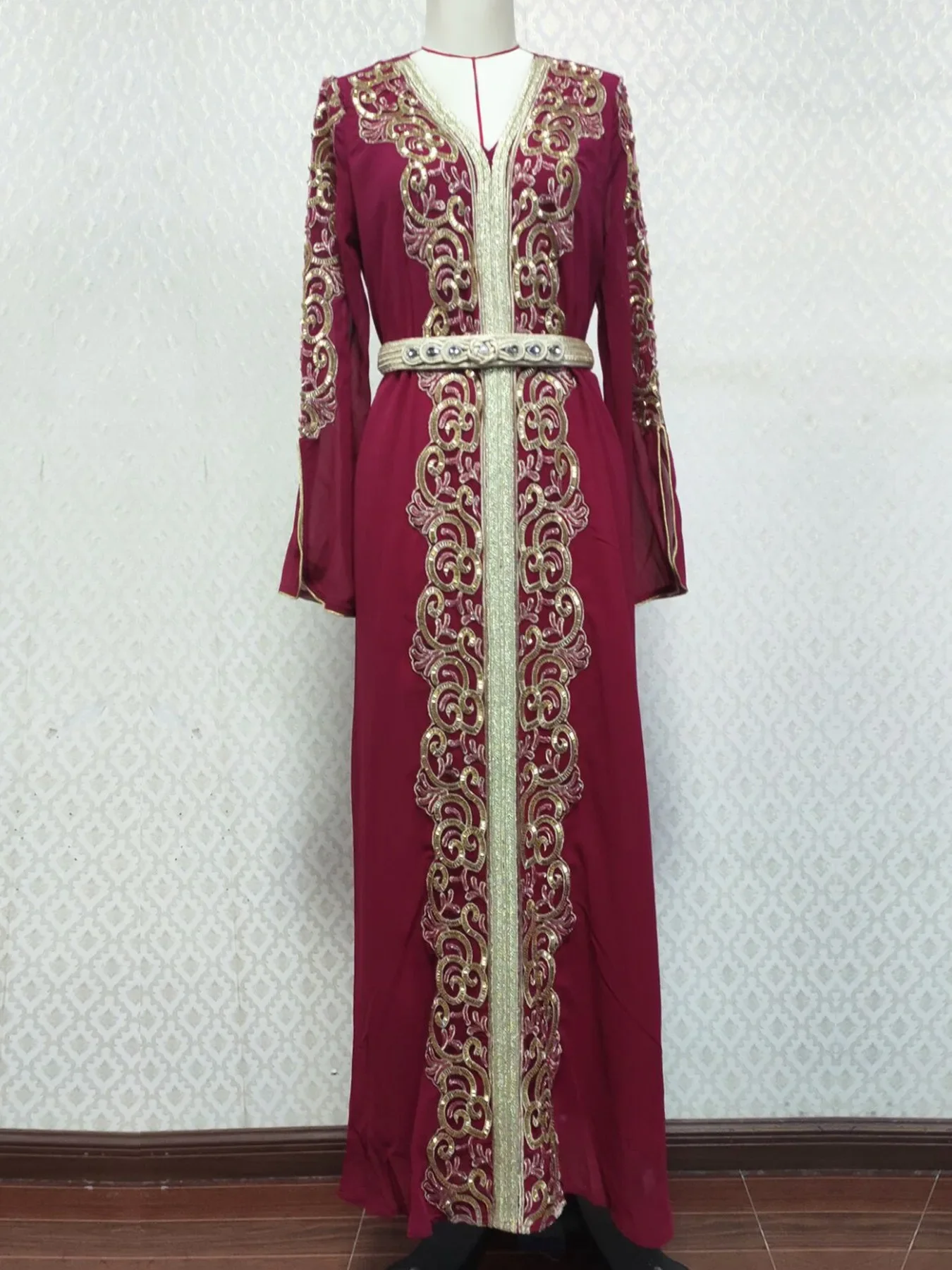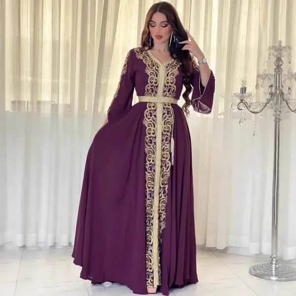Soyez le premier à laisser votre avis sur “Caftan de Luxe “Altesse Pourpre” avec Broderies d’Or et Perlage”