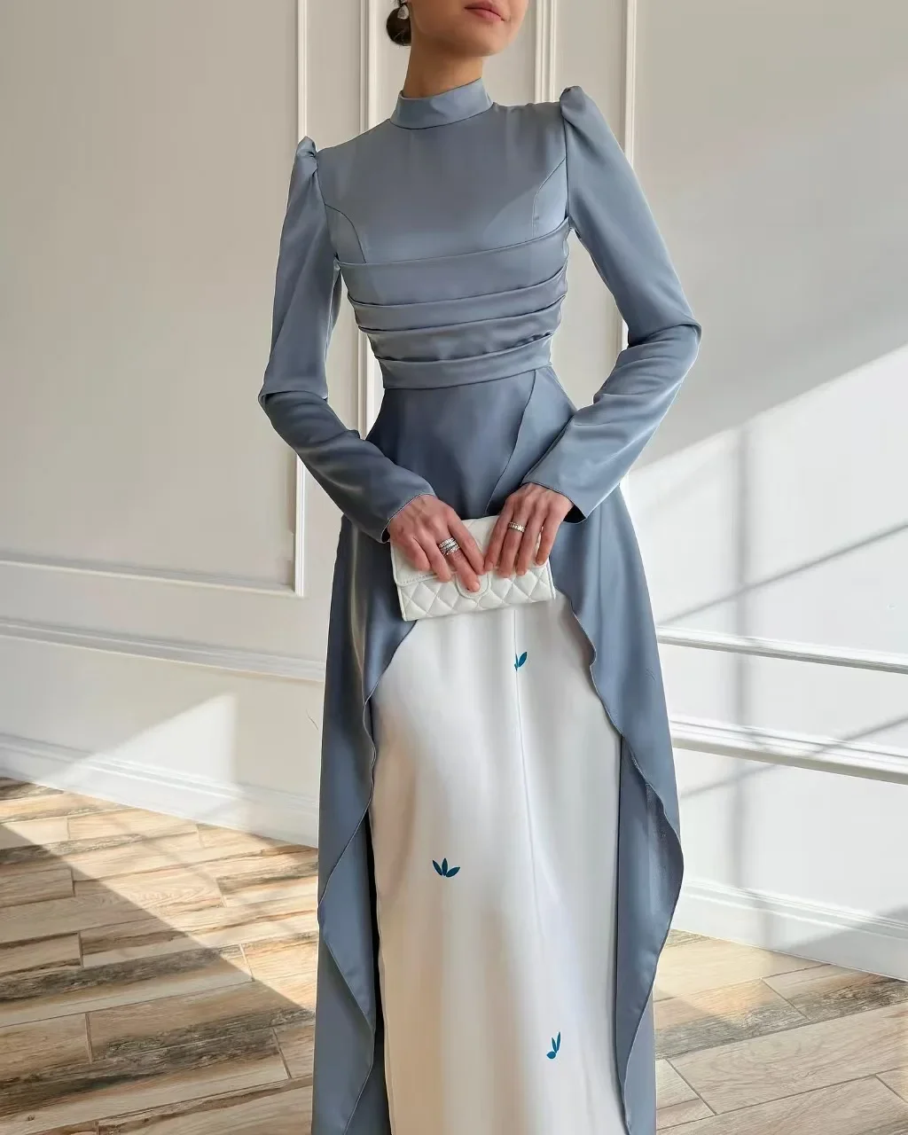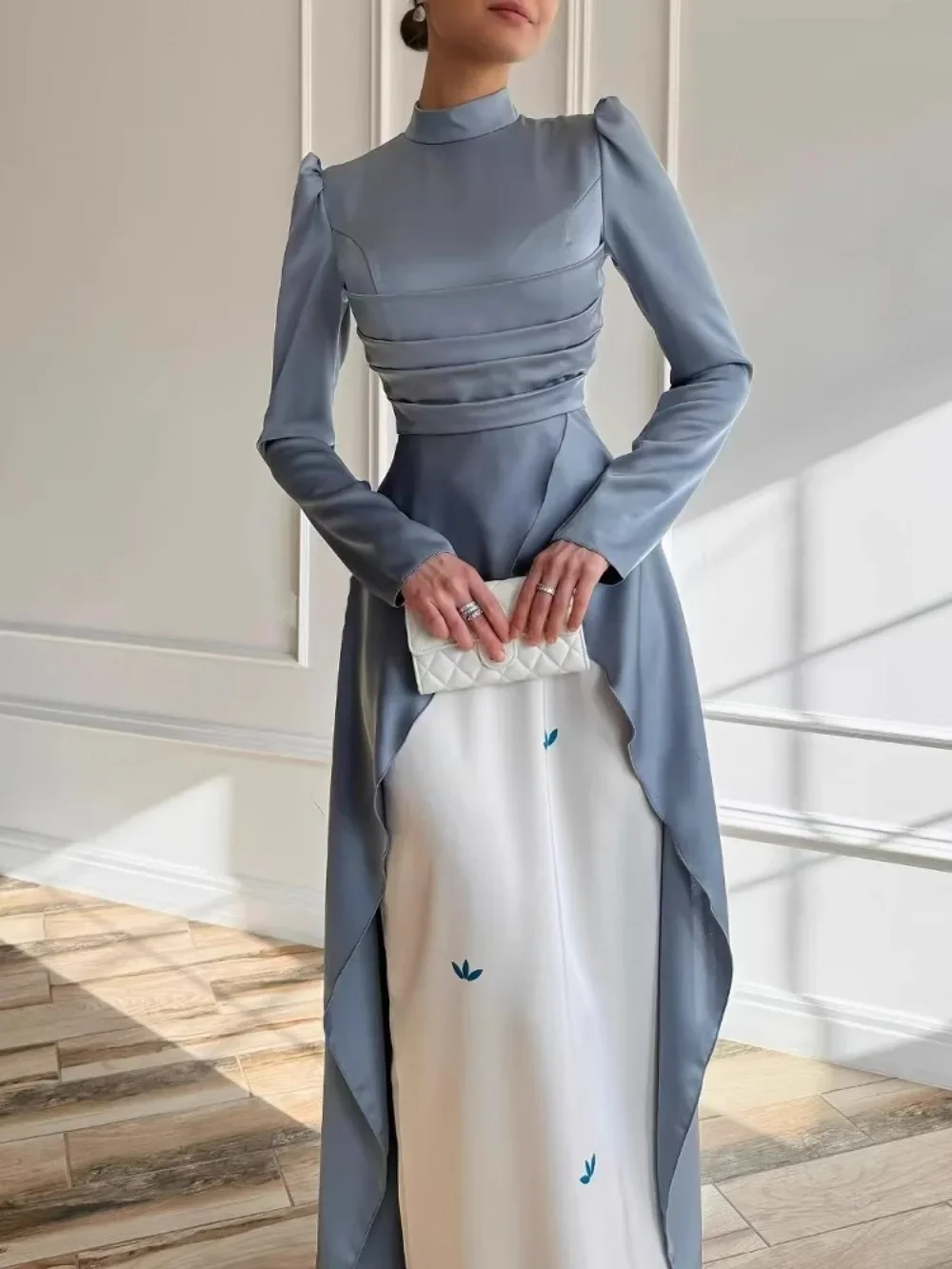 L’Abaya de soirée bicolore est une pièce d’ingénierie mode. Le haut de la robe présente un bustier drapé bleu acier aux reflets satinés, qui se prolonge en une cape majestueuse retombant jusqu’au sol, créant un effet de traîne royale.