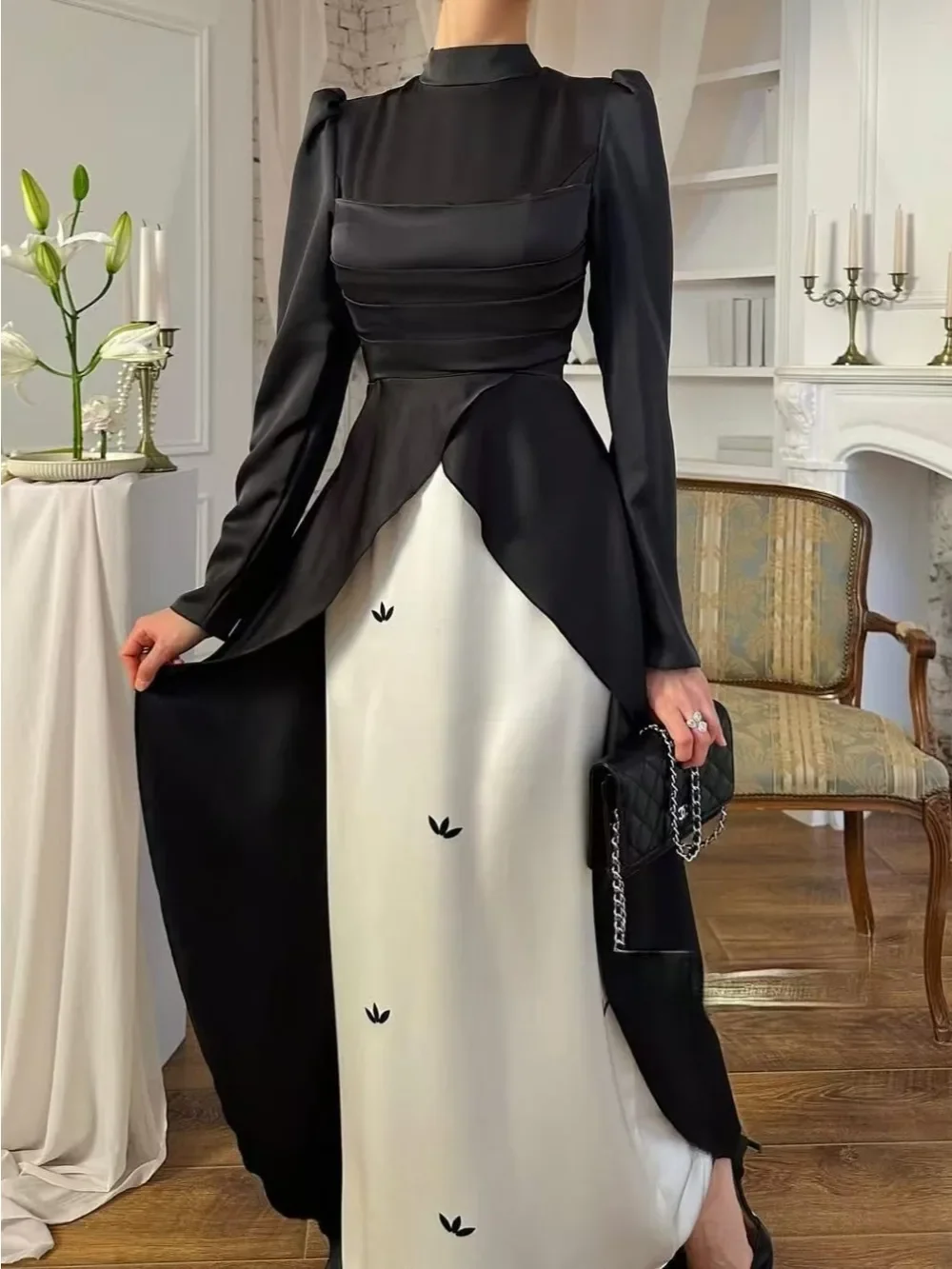 Le contraste est saisissant avec la jupe de couleur ivoire, ornée de petits motifs floraux brodés en vert émeraude, apportant une touche de couleur subtile et artisanale. Les épaules légèrement structurées et le col montant confèrent une allure autoritaire et sophistiquée, idéale pour celles qui veulent sortir des sentiers battus de la mode orientale classique.