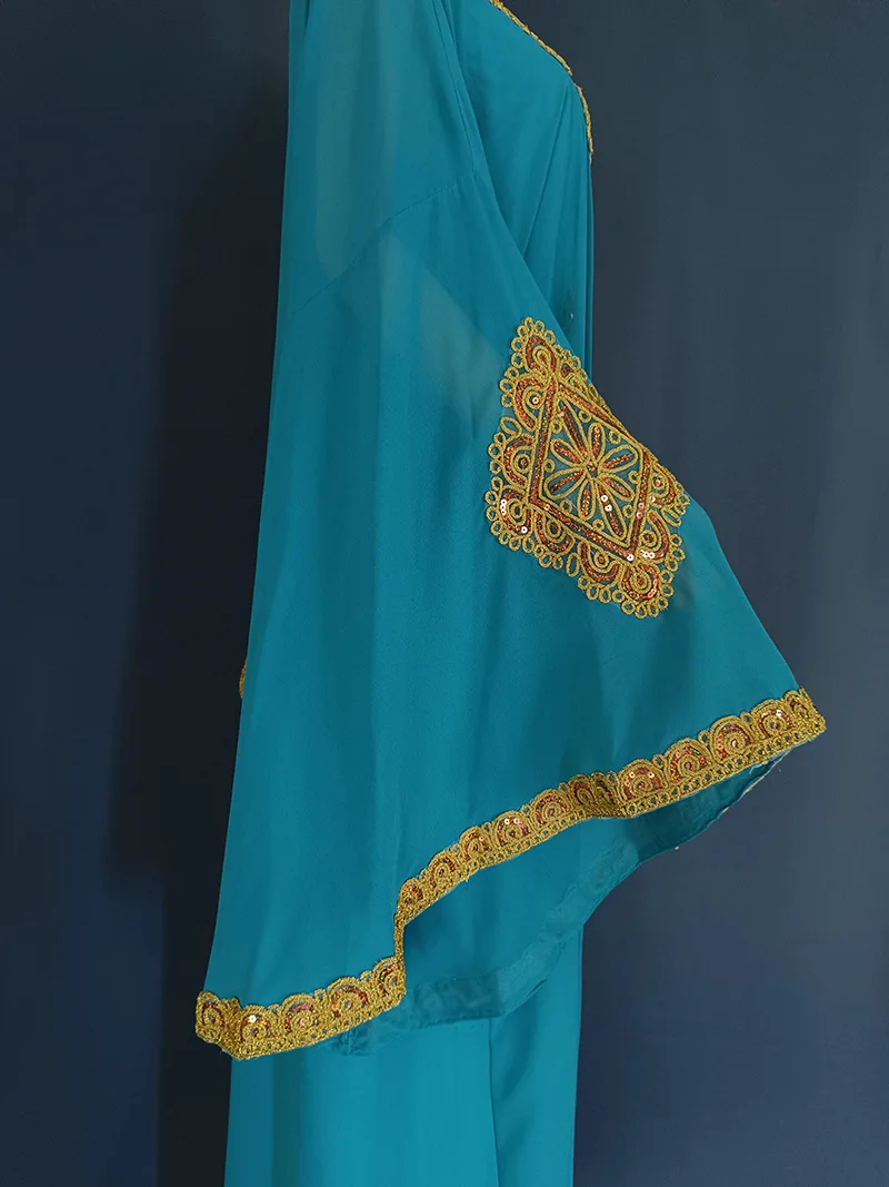 Splendeur et élégance avec notre Caftan papillon bleu pétrole orné de broderies or. Une pièce maîtresse pour l’Aïd et vos mariages en France, Belgique et Angleterre. Livraison luxe disponible sur Paris et toute la région parisienne.