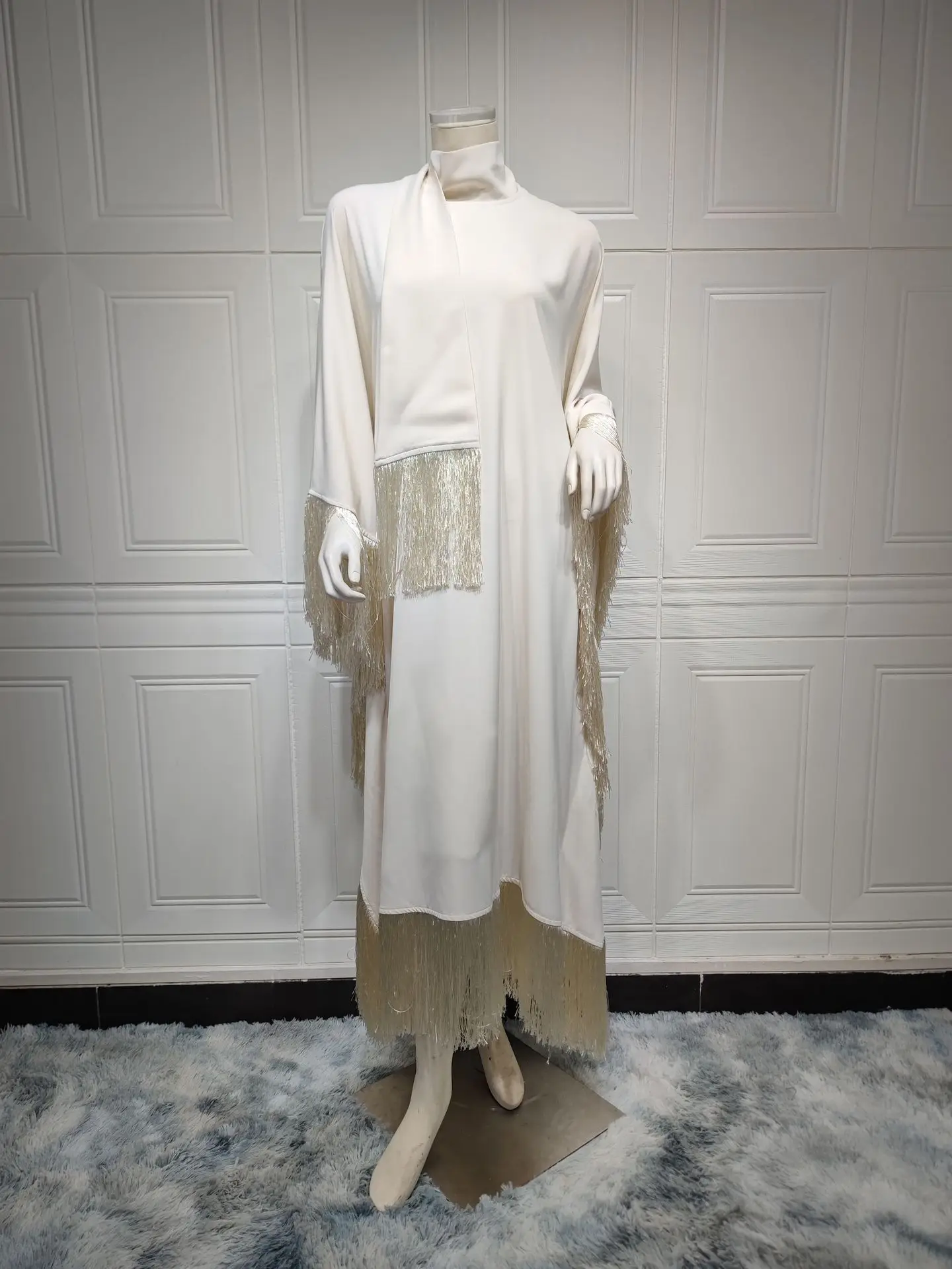 Adoptez un look avant-gardiste avec notre Djellaba Blanche de Luxe  immaculée ornée de franges soyeuses. Une pièce unique pour l’Aïd et vos événements de prestige. Livraison rapide en France, Belgique, Suisse et aux Émirats.