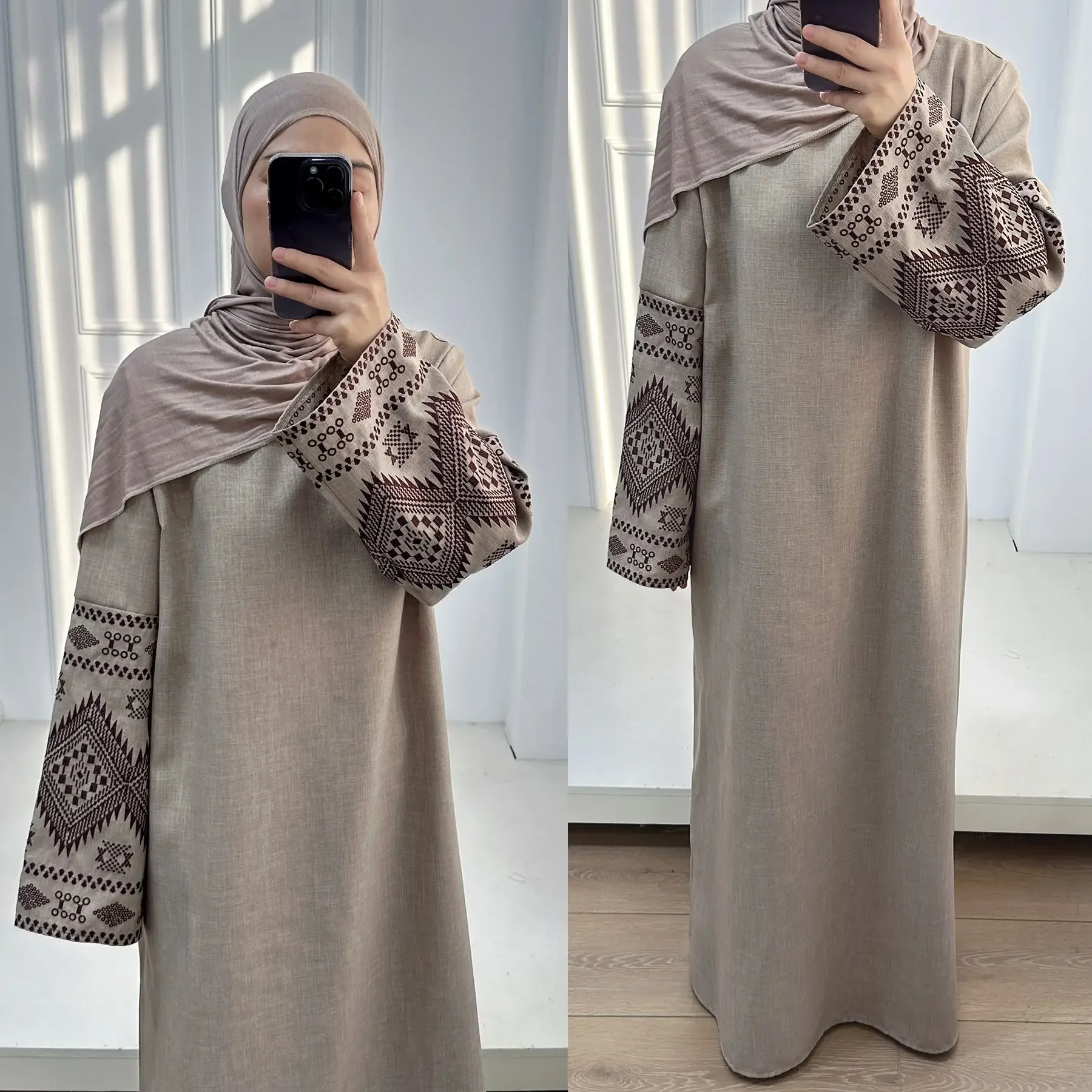 Le Djellaba “Sable d’Orient” est l’incarnation parfaite du style néo-traditionnel. Confectionnée dans un tissu en lin mélangé de haute qualité, elle offre une texture naturelle et une tenue impeccable. Sa teinte crème (off-white) apporte une luminosité instantanée, tandis que les broderies géométriques complexes de couleur marron chocolat sur les manches créent un contraste élégant et artisanal.