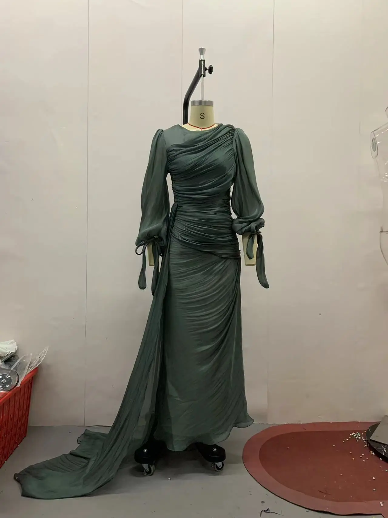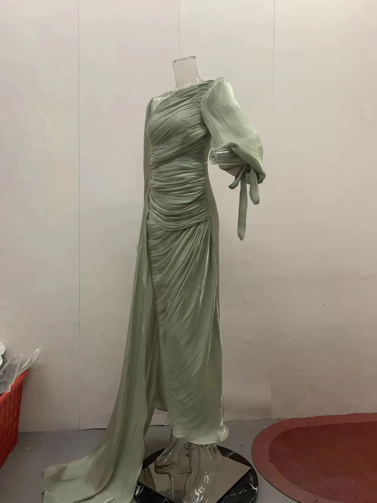 La Jupe : Le drapé se prolonge sur la longueur de la robe, créant un effet de superposition qui rappelle les tenues de défilé.