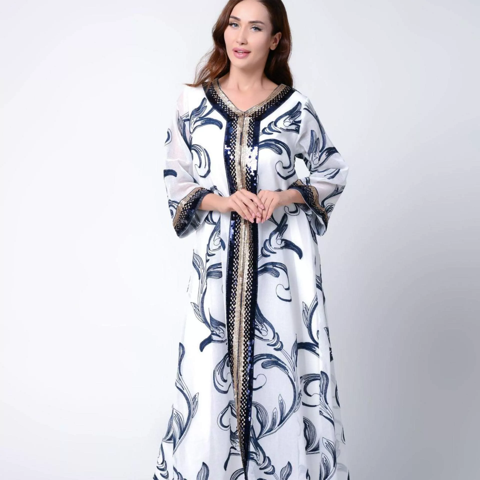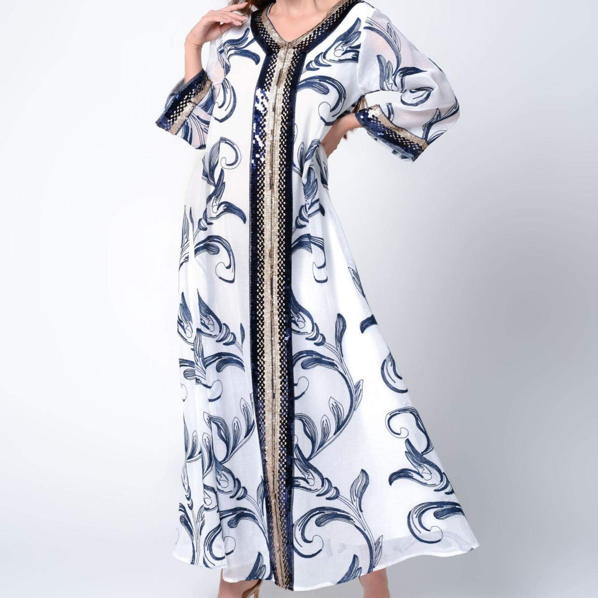 Avec son coloris blanc et ses motifs floraux bleus, cette robe longue marocaine est idéale pour plusieurs situations comme vos journées à la maison ou encore vos sorties !
