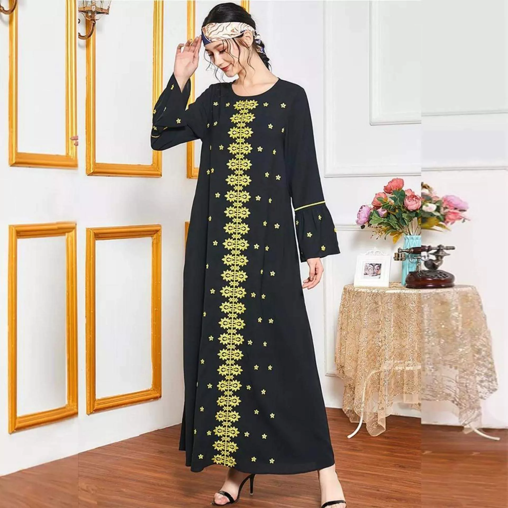 Avec son coloris noir et broderies jaunes, cette robe orientale est idéale lors de vos déplacements en extérieur !
