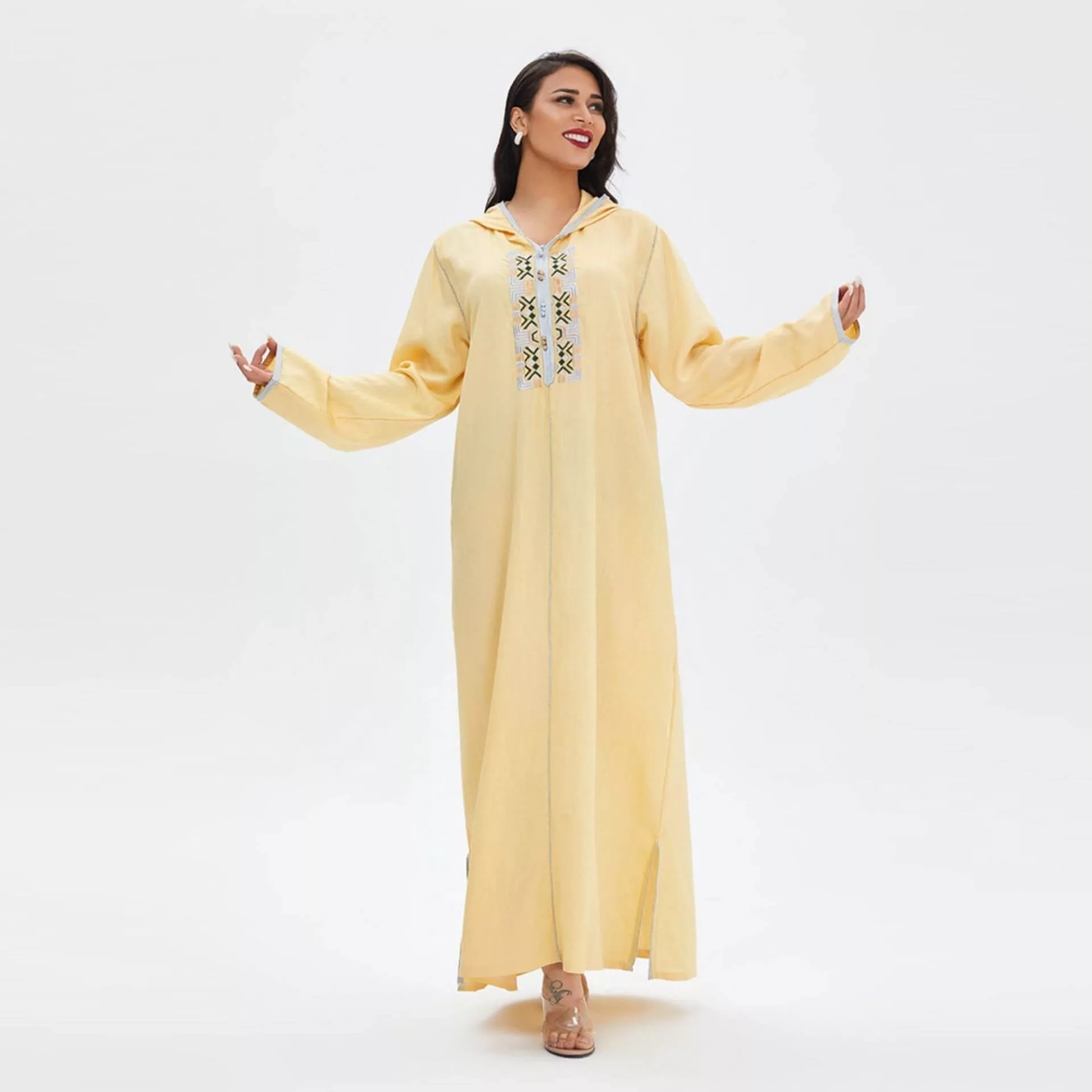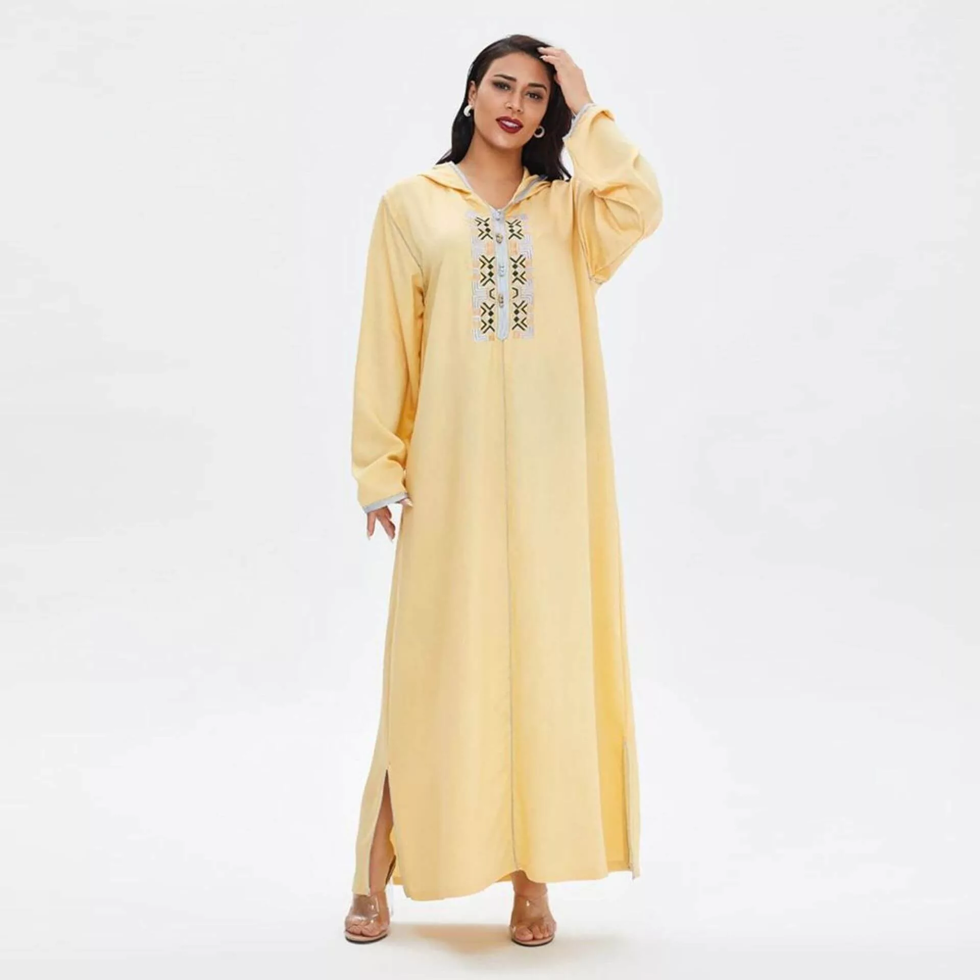 Avec ses motifs simples et légers, cette robe arabe moderne à capuche peut parfaitement être porté comme tenue de maison lors de vos journées de repos mais aussi en mode détente lors de vos sorties !
