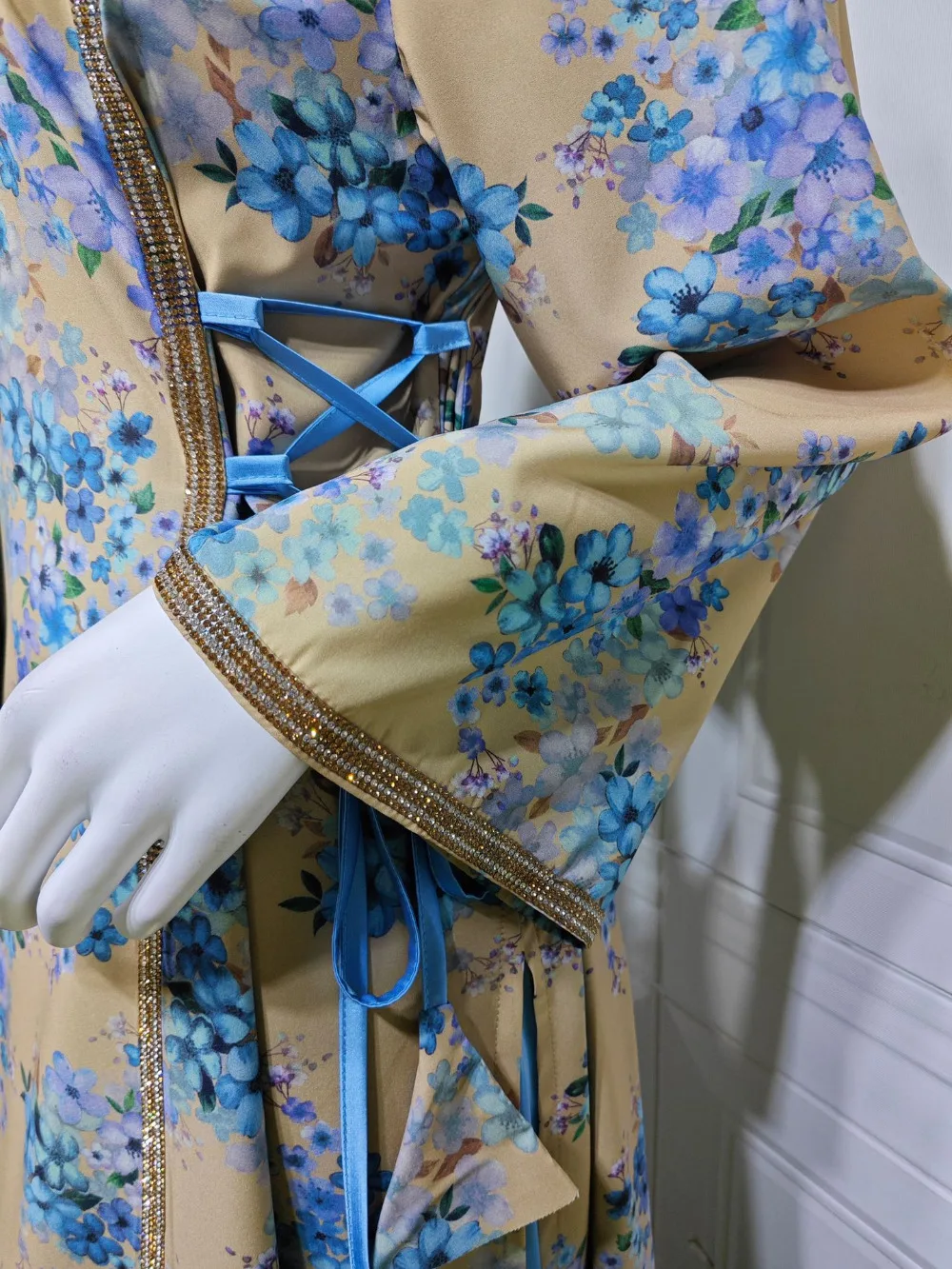 - Imprimé Romantique : Un motif floral délicat dans les tons bleu ciel et turquoise sur un fond beige sable, évoquant la douceur des jardins de Turquie et du Maghreb.