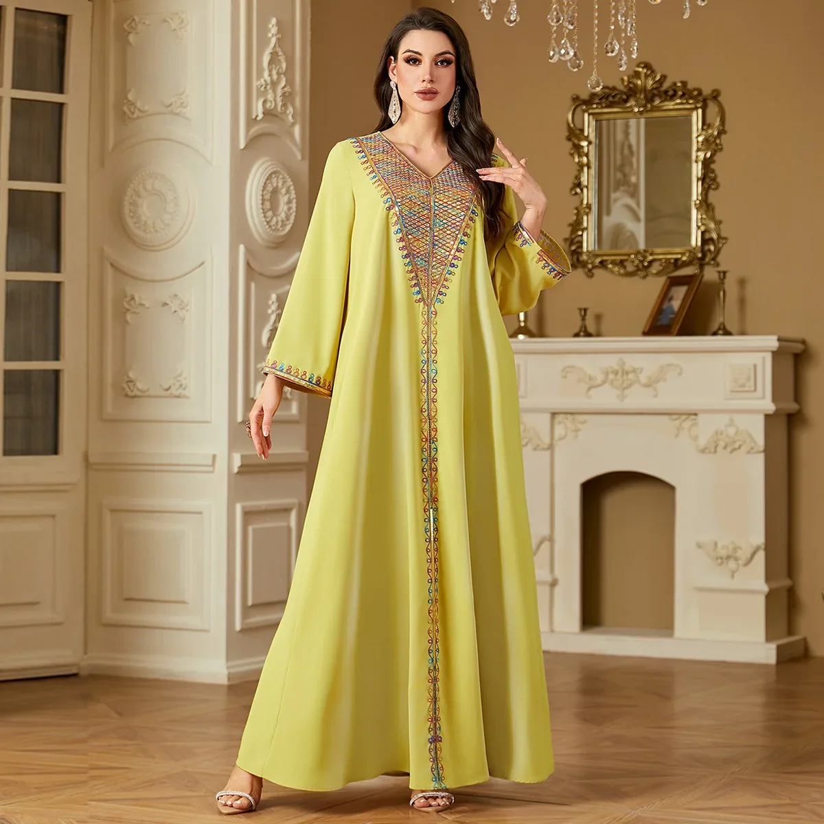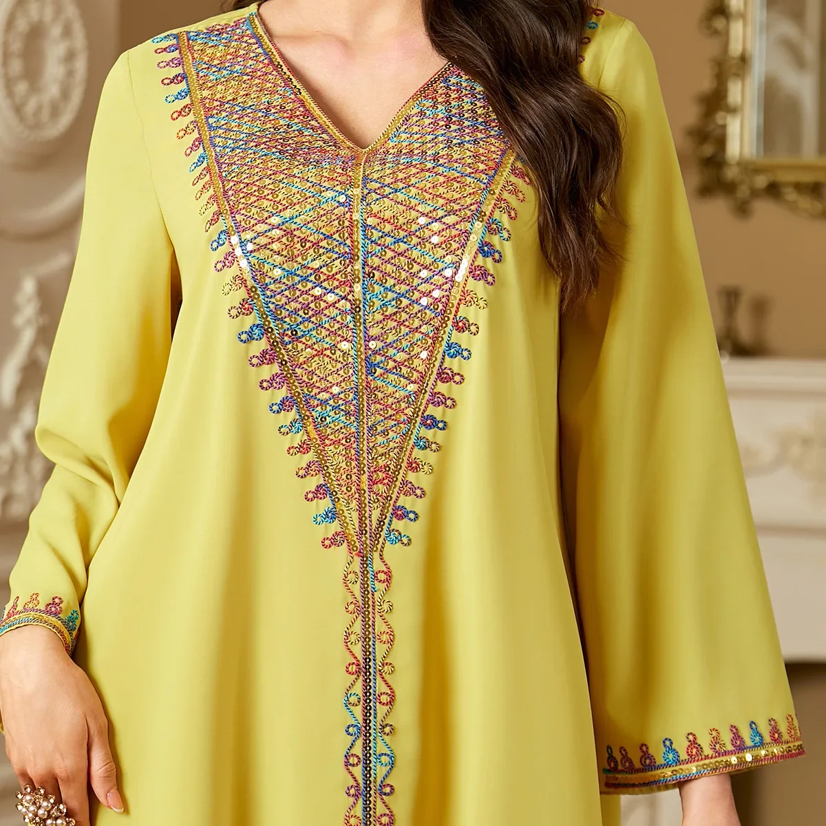 Cette Djellaba marocaine revisitée est l’équilibre parfait entre sobriété et festivité. Sa teinte jaune citron, lumineuse et énergique, est idéale pour les célébrations de l’Aïd (Eid) ou les soirées de Ramadan. Le point fort de ce modèle réside dans son plastron finement brodé de motifs géométriques multicolores, apportant une touche de gaieté artisanale.