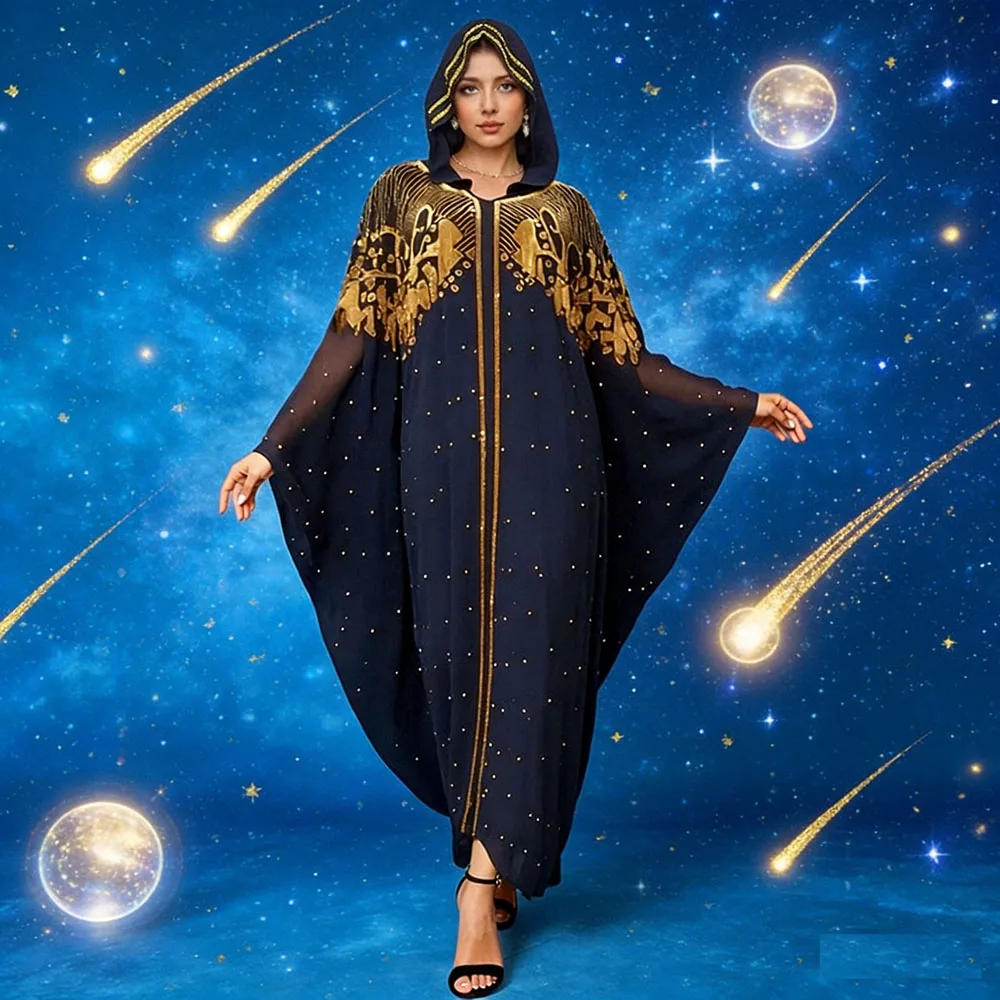 - Ornementation Royale : Le buste et la capuche sont rehaussés de broderies dorées complexes aux motifs baroques, créant un contraste saisissant et luxueux digne des créations de Turquie.