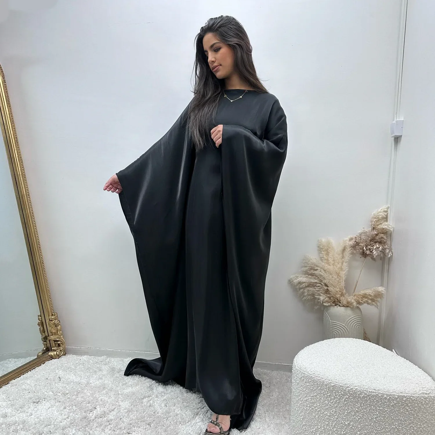 Le design repose sur la célèbre coupe Farasha (papillon), offrant une amplitude généreuse qui garantit une opacité totale et un confort absolu. L’éclat naturel du satin crée des jeux de lumière sophistiqués à chaque pas. Que vous soyez à Paris, Marseille ou Dubaï, ce Djellaba est une déclaration de style qui fusionne le minimalisme moderne et la tradition orientale.