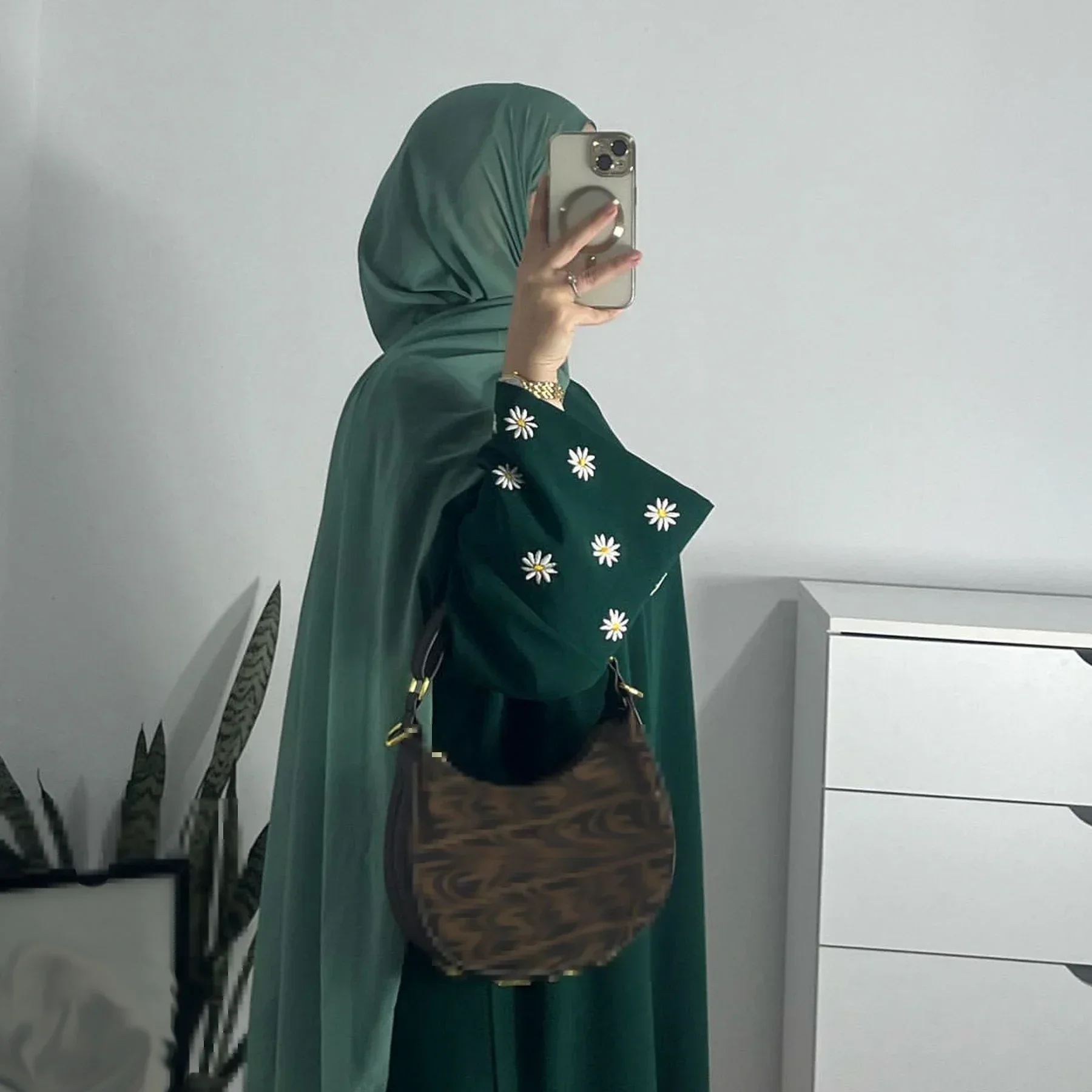 Contraste Élégant : Le mariage du vert foncé et des broderies blanches crée un impact visuel chic et immédiat.