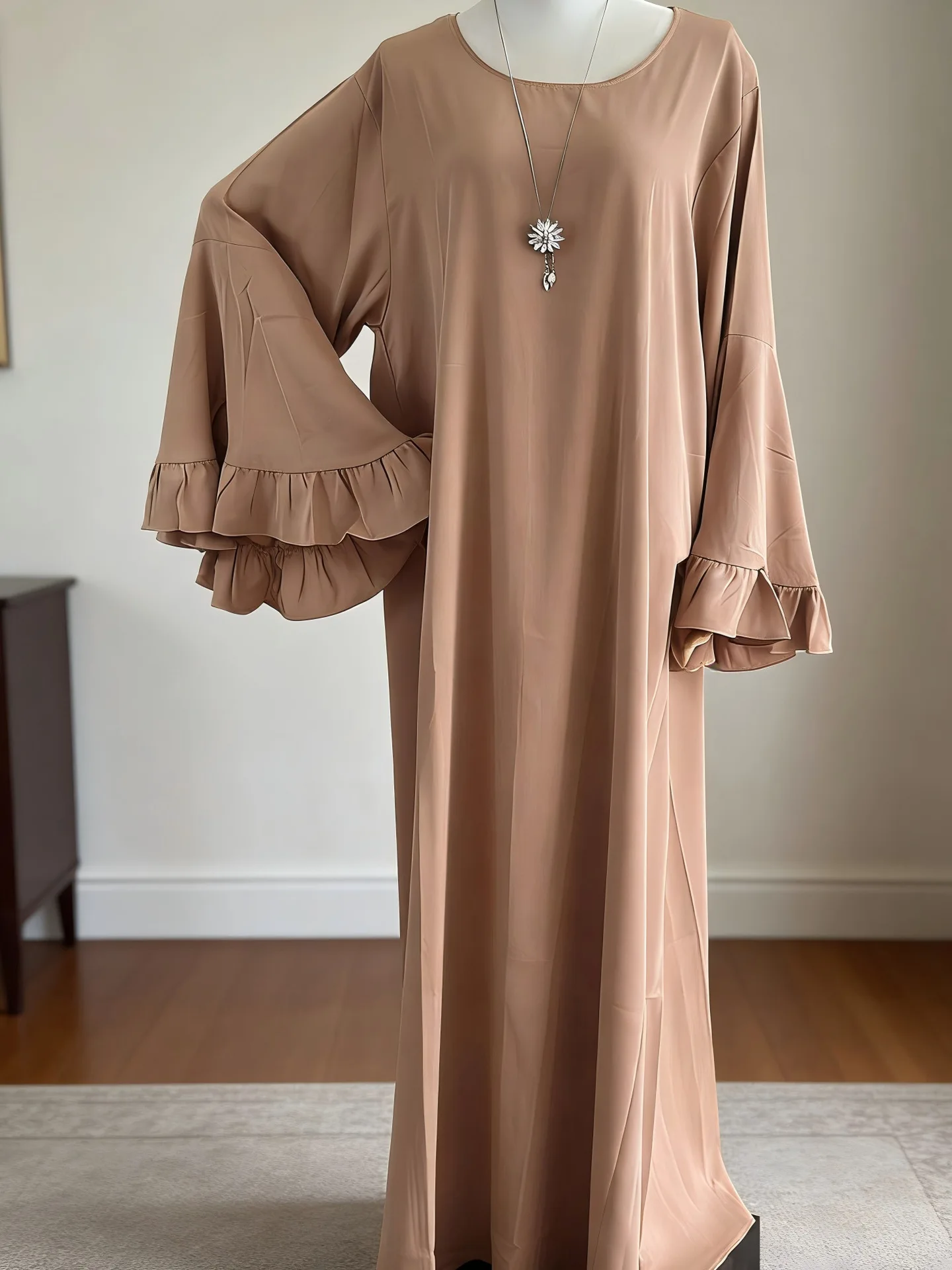 Adoptez une allure douce et aérienne avec notre Djellaba aux manches volantées couleur caramel. Une pièce fluide et pudique qui combine parfaitement confort quotidien et élégance orientale, disponible pour nos clientes à Paris, Marseille, Bruxelles et au-delà.