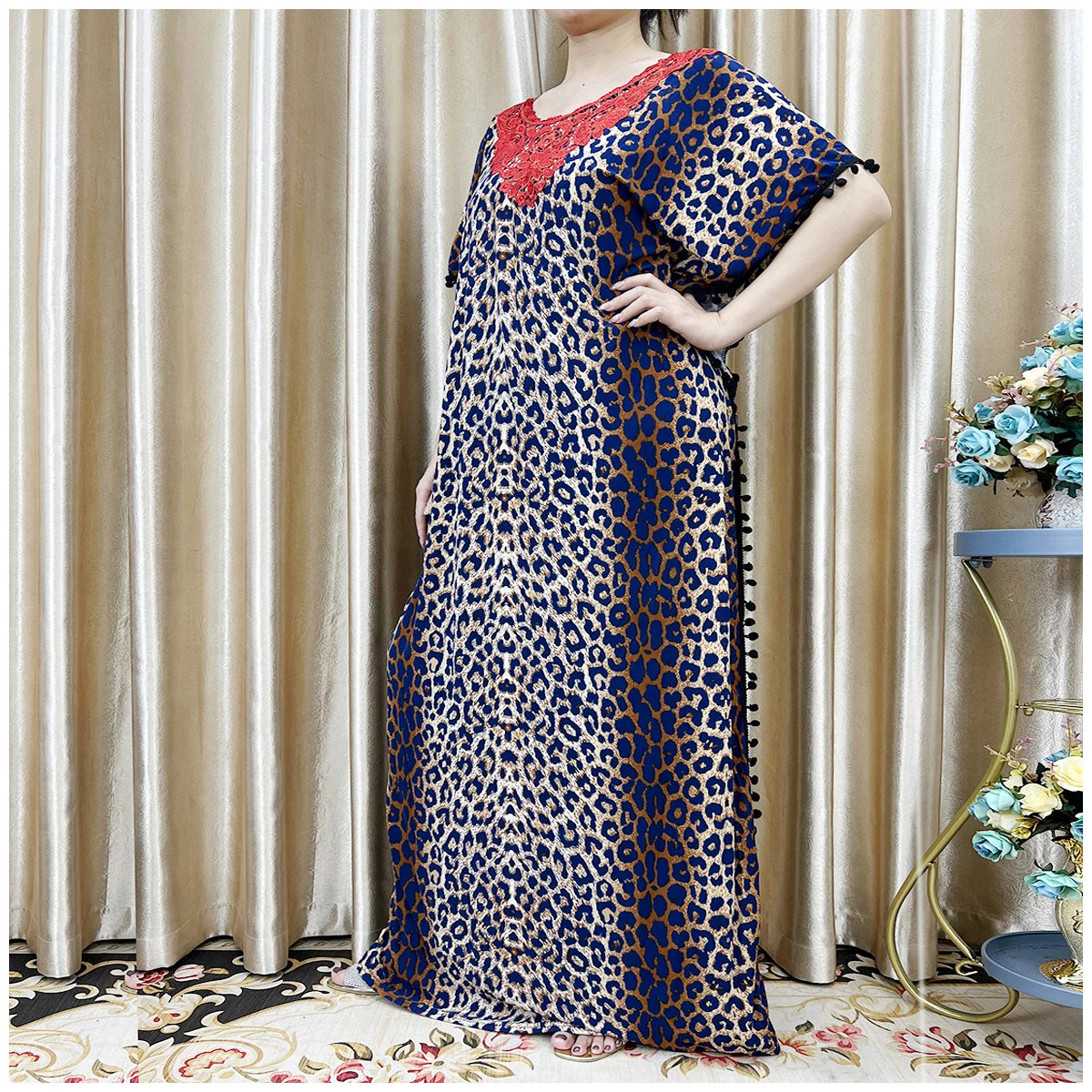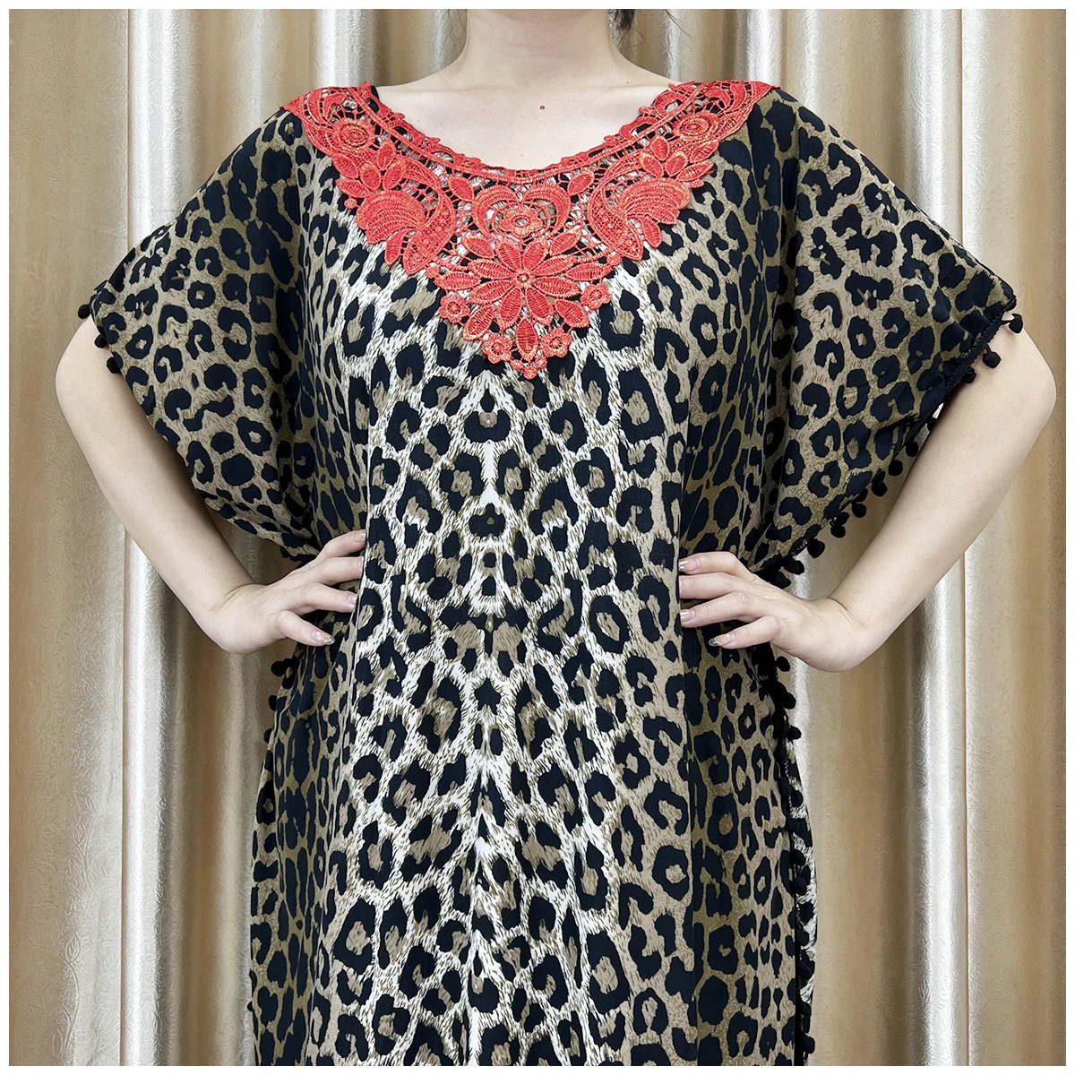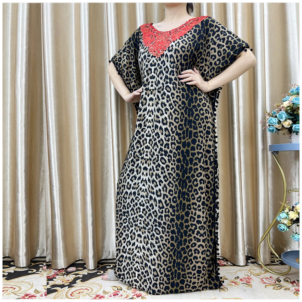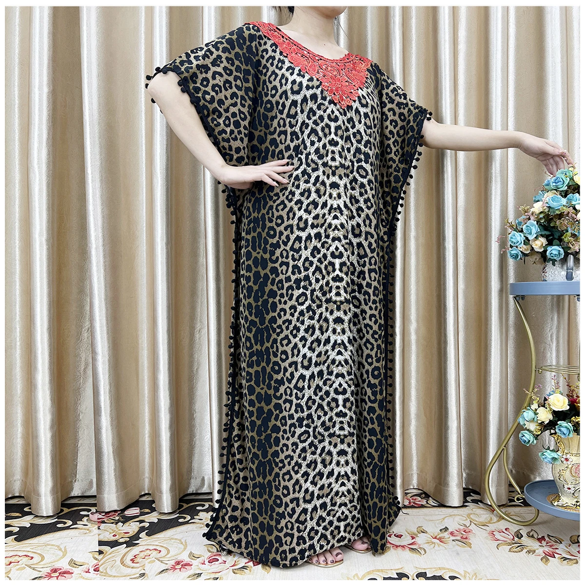 Détails et Matières : Le contraste saisissant Le point fort de cette Abaya moderne réside dans son contraste visuel. L’imprimé léopard, intemporel et puissant, est adouci par une magnifique pièce de dentelle rouge brodée au niveau de l’encolure. Ce détail apporte une touche de couleur vive qui illumine le visage. Les finitions latérales sont ornées de petits pompons délicats (Sfifa revisitée), rappelant le savoir-faire artisanal des Djellabas traditionnelles mais avec une touche de modernité propre au style de Paris.