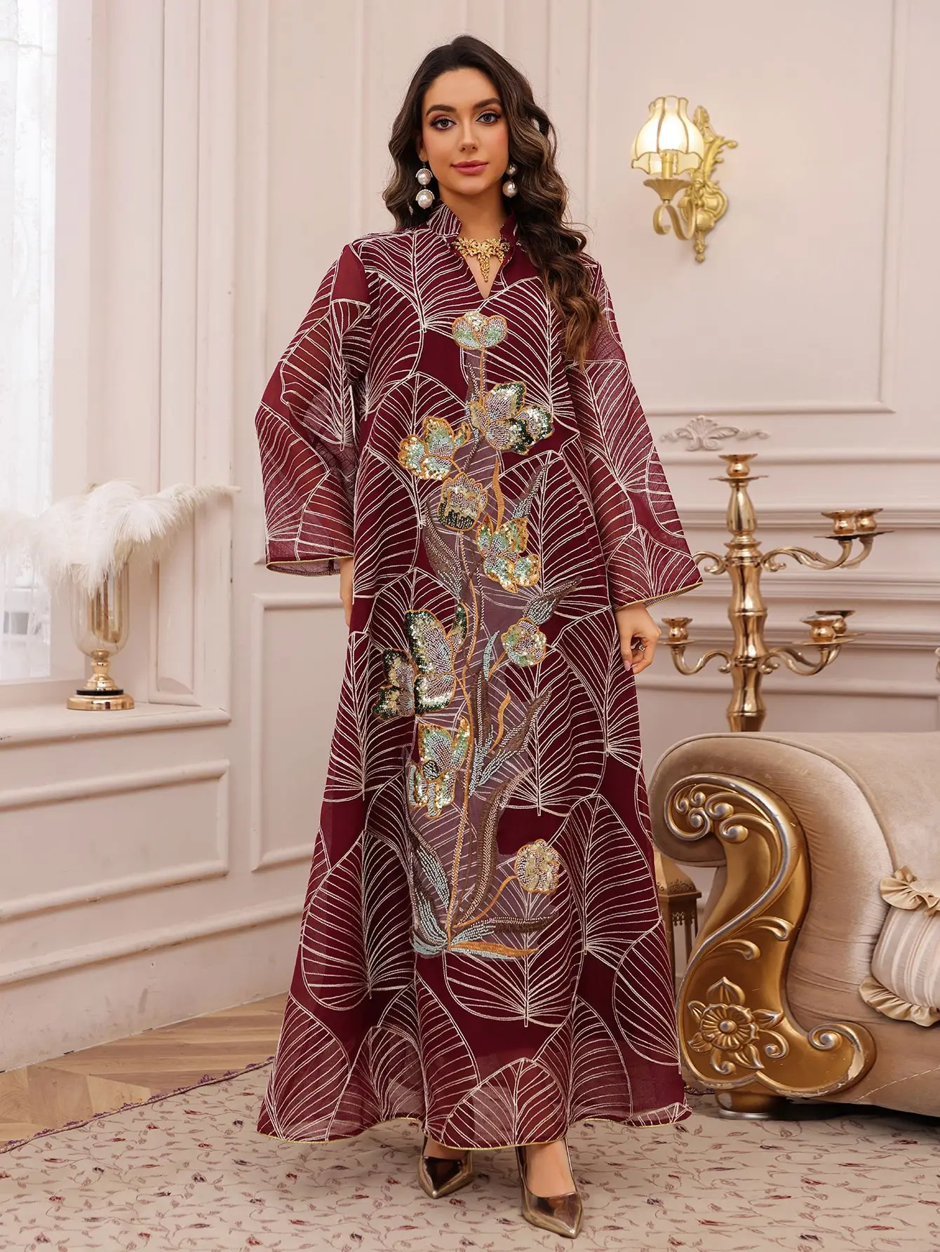 Lumière et Éclat : Les sequins et fils d’or captent la lumière ambiante, assurant un éclat subtil mais constant.