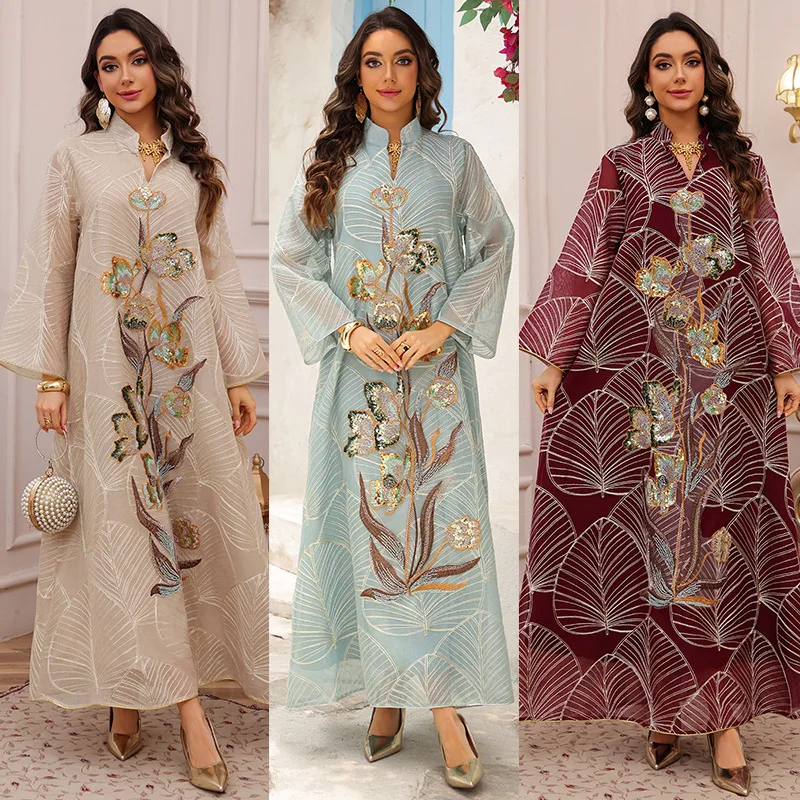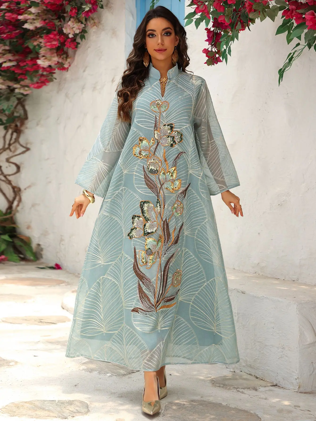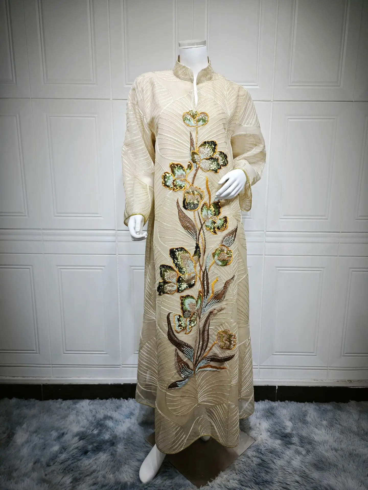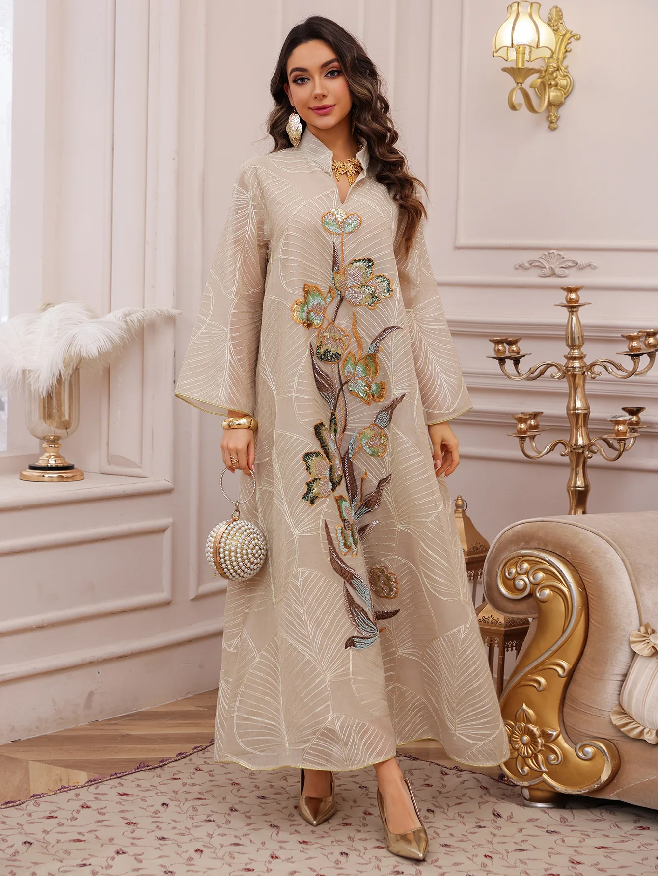 Le Travail de Broderie et de Perlage : Le point focal de cette pièce est l’imposante fresque florale qui s’étend verticalement sur le devant. Réalisée avec des fils d’or et des sequins délicatement posés à la main, cette broderie représente des fleurs épanouies aux reflets nacrés et cuivrés. Cette disposition verticale n’est pas seulement esthétique : elle a été pensée pour élancer la silhouette et attirer le regard vers le port de tête.