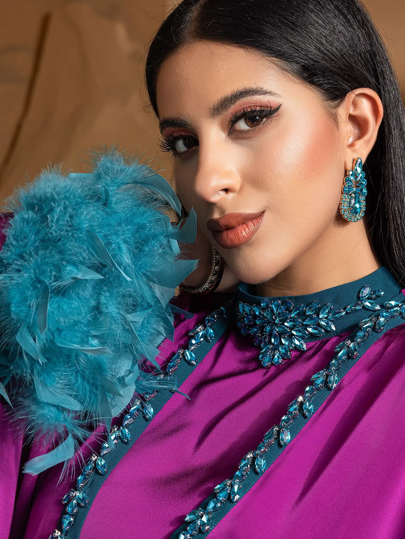 - Détails Couture “Teal” : Les poignets sont magnifiés par des cascades de plumes d’autruche synthétiques bleu canard, tandis que l’encolure et le liseré central sont bordés de broderies en cristaux assortis.