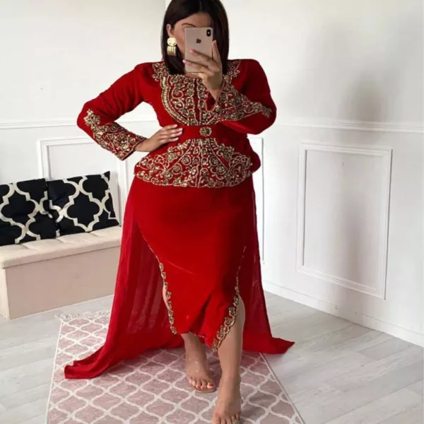 Le rouge est une de couleurs les plus appréciées de nos clientes, avec son design moderne et ses broderies haut de gamme, ce modèle de robe orientale est très prisée.