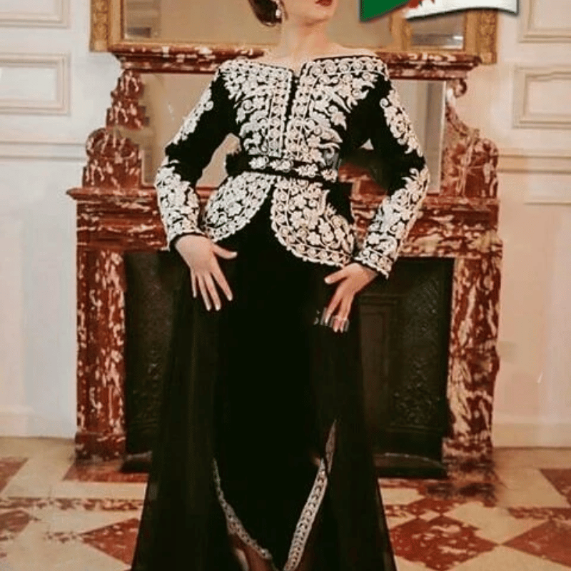 Avec son coloris noir élégant et sobre ainsi que ses broderies argentées, cette robe kabyle est parfaite pour vos soirées !