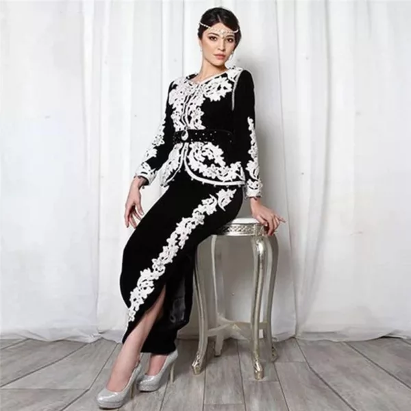 Le Karakou est une robe de mariage traditionnelle algérois ! Avec son coloris noir et ses différents ornements argentées, il peut également être porté lors des grandes occasions ! Nous avons voulu une tenue représentant parfaitement les coutumes algériennes !