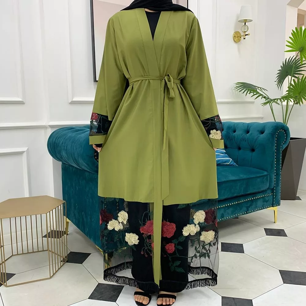 Découvre le kimono vert pour femme musulmane, semi-transparent sur les manches et le bas de la tenue. Ce kimono abaya pour femme est ajustable avec son turban à la taille. Ce kimono pour femme musulmane t’apportera un style moderne et tendance. Son design épuré, son tissu confortable et léger, tout cela contribue à leur apporter un look élégant sans compromettre le confort.